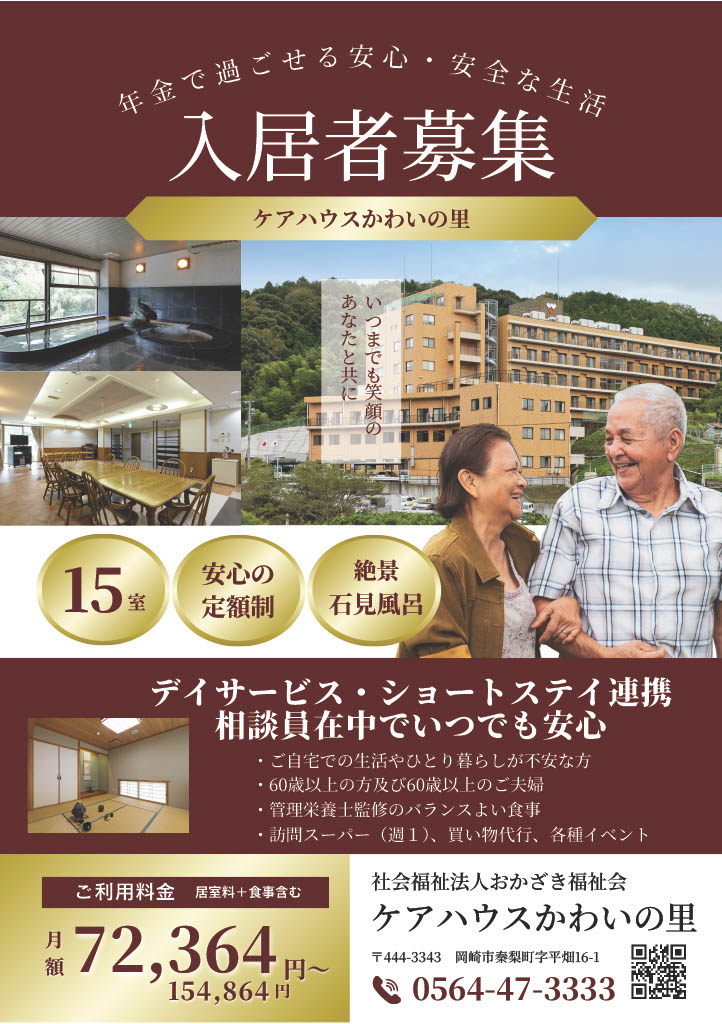 ただいま「ケアハウスかわいの里」(軽費老人ホーム:岡崎市秦梨町)では、ご入居希望者を募集しております。
